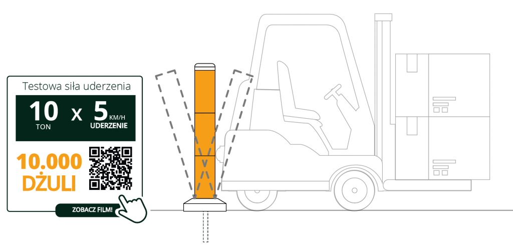 Każdy słupek wytrzymuje energię uderzenia nawet do 10 000 J, co jednoznacznie świadczy o jego wyjątkowej wytrzymałości mechanicznej. W praktyce oznacza to, że B-Protect® radzi sobie z naprawdę poważnymi incydentami, minimalizując skutki kolizji.