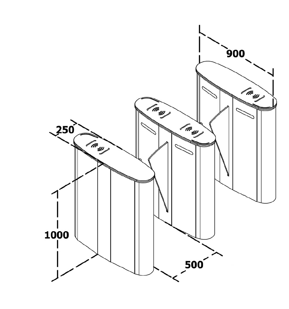 T 300 HG 20 to nowoczesna bramka sensoryczna typu HG (Hidden Gate), przeznaczona do prestiżowych przestrzeni, w których liczy się estetyka wnętrza. Sprawdza się w hotelach, uczelniach, centrach biznesowych, urzędach i ministerstwach, bankach oraz na lotniskach. Korpus wykonano ze stali nierdzewnej AISI 304, skrzydła stanowią wzmocnione tafle hartowanego szkła o grubości 10 mm, a górne pokrywy z hartowanego szkła 12 mm, co podkreśla nowoczesny charakter konstrukcji. Istnieje możliwość naniesienia logo na skrzydła; opcjonalnie mogą one być wykonane z PVC. Elementy mechaniczne są specjalnie powlekane dla ochrony przed korozją, a elektronika Makim umożliwia różne tryby pracy i integrację z systemami kontroli dostępu.