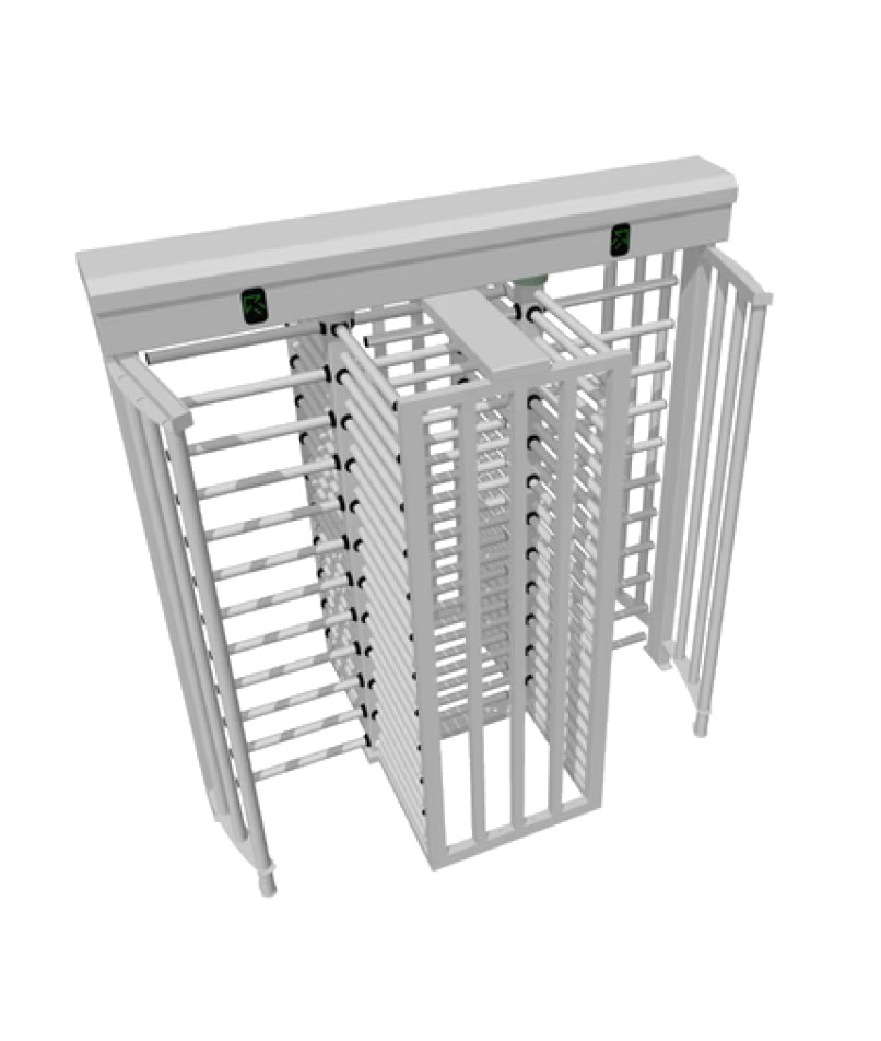 T 2500 D Double to podwójna, 4-ramienna wysoka bramka obrotowa do zastosowań wewnętrznych i zewnętrznych, m.in. na budowach, w zakładach przemysłowych, na stadionach, kampusach i w obiektach o podwyższonym poziomie bezpieczeństwa. Wykonana ze stali nierdzewnej 304 lub malowanej proszkowo (opcjonalnie 316), z wytrzymałym mechanizmem precyzyjnego odlewu, zapewnia długą i bezawaryjną pracę. Po autoryzacji odblokowuje się i automatycznie blokuje po przejściu, umożliwiając ponad 30 przejść na minutę. W przypadku zaniku zasilania umożliwia swobodne przejście lub pracę z zasilaniem bateryjnym.