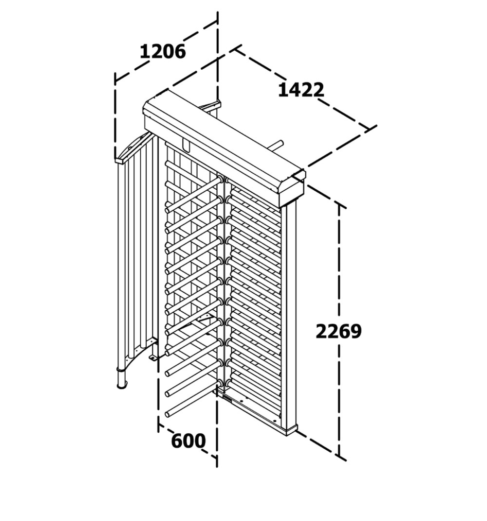 T 2500 D Single to pojedyncza, 4-ramienna wysoka bramka obrotowa do zastosowań wewnętrznych i zewnętrznych, m.in. na budowach, w zakładach przemysłowych, na stadionach i kampusach. Wykonana ze stali nierdzewnej 304 lub malowanej proszkowo (opcjonalnie 316), z trwałym mechanizmem precyzyjnego odlewu, zapewnia długą i bezawaryjną pracę. Bramka pracuje dwukierunkowo i integruje się z systemami kartowymi, biometrycznymi, pilotem lub przyciskiem. Po autoryzacji odblokowuje się, a po przejściu automatycznie się blokuje, umożliwiając ponad 30 przejść na minutę. W przypadku zaniku zasilania pozwala na swobodne przejście lub pracę z zasilaniem bateryjnym.
