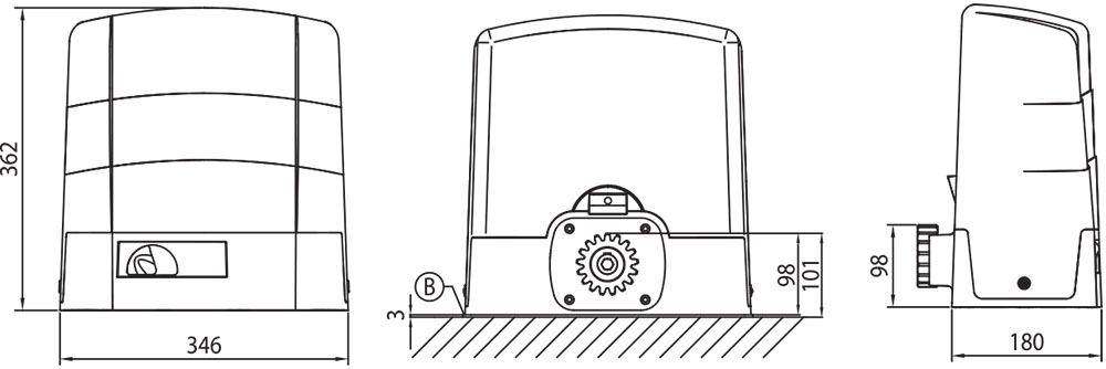 Napęd z silnikiem 230 V, do bram przesuwnych o max ciężarze 1800 kg, z enkoderem optycznym, wbudowaną centralą H70/104/AC i wyłącznikami magnetycznymi oraz podstawą i śrubami do montażu.
