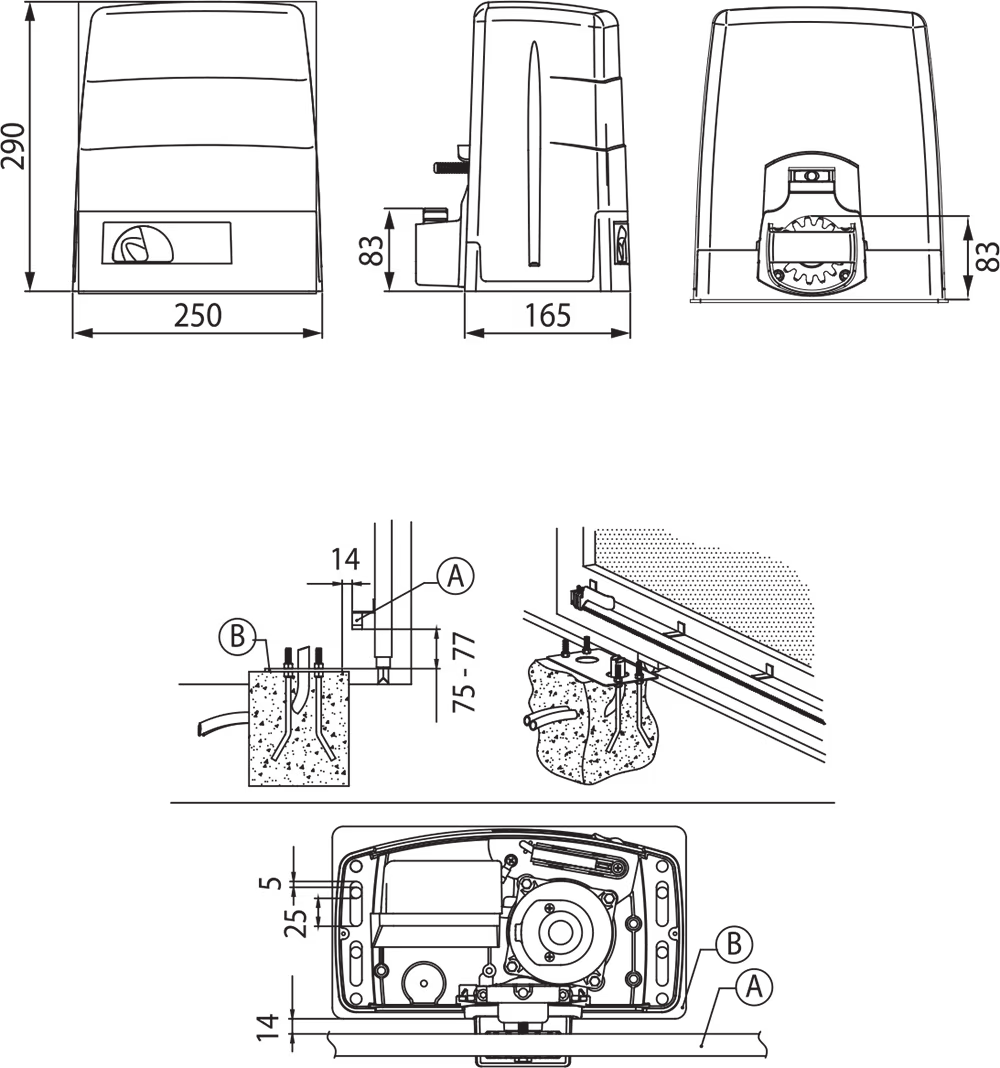 Napęd z silnikiem bezszczotkowym 24 V, do pracy bardzo intensywnej, do bram przesuwnych o max ciężarze 500 kg, z enkoderem absolutnym, wbudowaną centralą B70/1DC oraz radioodbiornikiem z podwójnym kodem stałym/zmiennym, i wyłącznikami mechanicznymi oraz podstawą i śrubami do montażu.